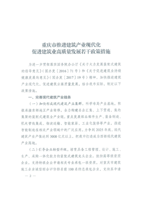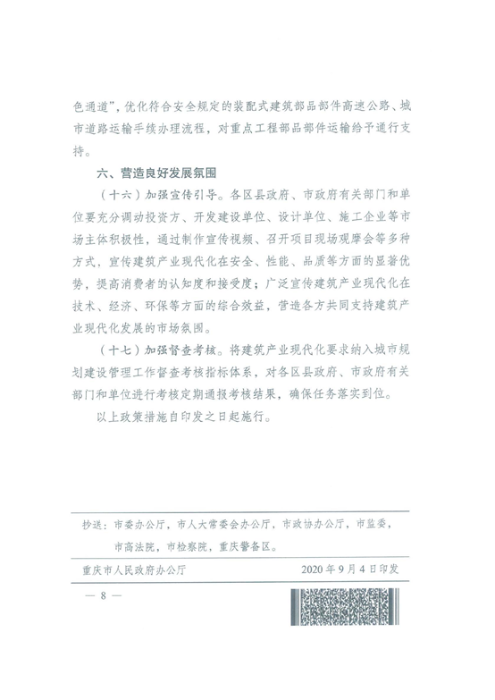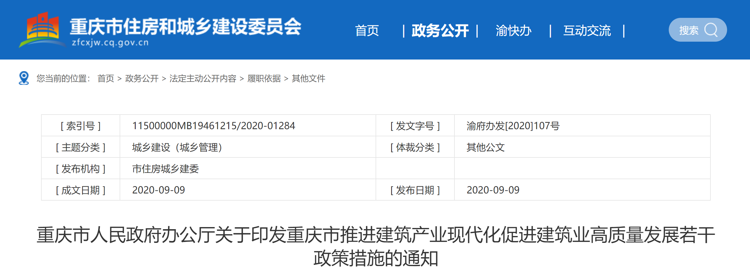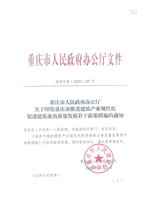为进一步贯彻落实国务院办公厅《关于大力发展装配式建筑的指导意见》(国办发〔2016〕71号)和《关于促进建筑业持续健康发展的意见》(国办发〔2017〕19号)精神,加快推进建筑产业现代化,促进建筑业高质量发展,重庆市人民政府办公厅近日印发《推进建筑产业现代化促进建筑业高质量发展若干政策措施》(渝府办发〔2020〕107号)。