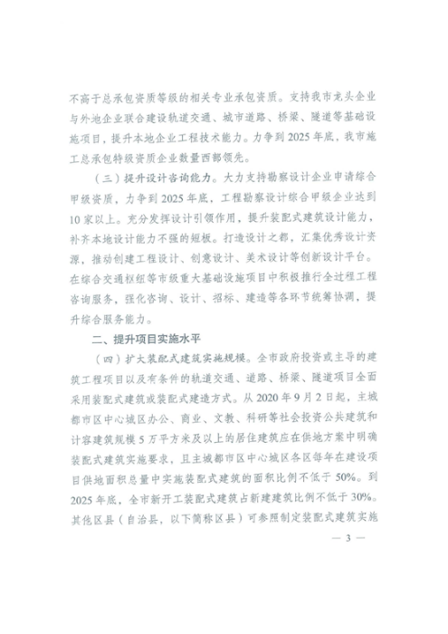 二、提升项目实施水平(四)扩大装配式建筑实施规模。全市政府投资或主导的建筑工程项目以及有条件的轨道交通、道路、桥梁、隧道项目全面采用装配式建筑或装配式建造方式。到2025年底,全市新开工装配式建筑占新建建筑比例不低于30%。(五)严格装配式建筑项目管理。建立装配式建筑预制部品部件驻场建造制度,将质量监督延伸至工厂。(六)实施建筑品质提升行动。以装配式建筑为突破口,提供高品质建筑产品,推动解决住宅质量通病问题。制定住宅性能标准,把人民群众普遍关心的安全、健康、通风、采光、遮阳、智能等性能作为住宅建设的重要指标。发展绿色建筑,进一步提高政府投资项目、大型社会投资项目二星级绿色建筑实施比例。制定健康建筑工程建设技术标准,引导发展健康建筑。继续实施施工现场形象品质提升行动计划,强化文明施工管理。
