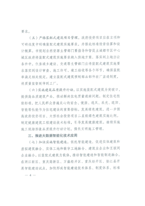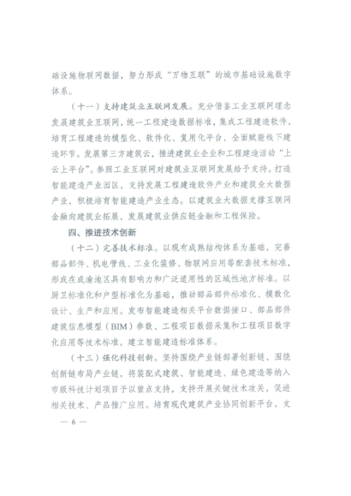 四、推进技术创新(十二)完善技术标准。以现有成熟结构体系为基础,完善部品部件、机电管线、工业化装修、物联网应用等配套技术标准,形成在成渝地区具有影响力和广泛适应性的区域性地方标准。(十三)强化科技创新。