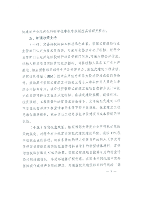 五、加强政策支持(十四)完善招投标和工程总承包政策。(十五)落实优惠政策。按照西部大开发企业所得税优惠政策的规定,对符合有关规定的装配式建筑建设单位,减按15%税率征收企业所得税。