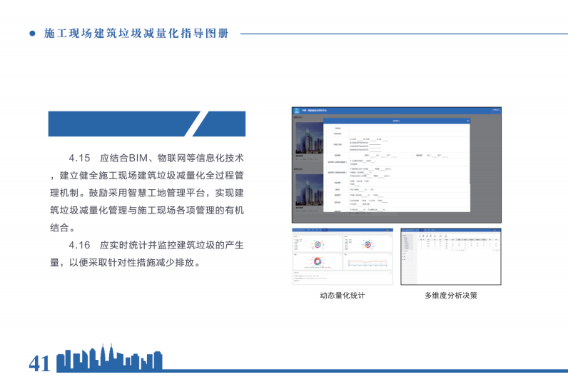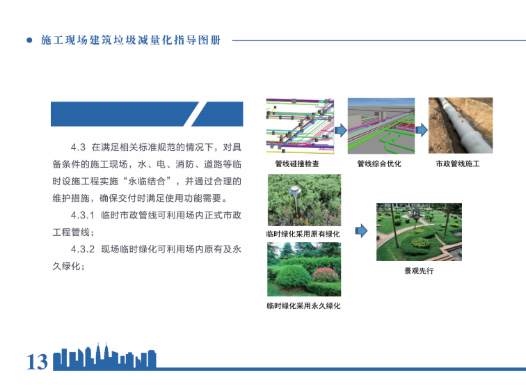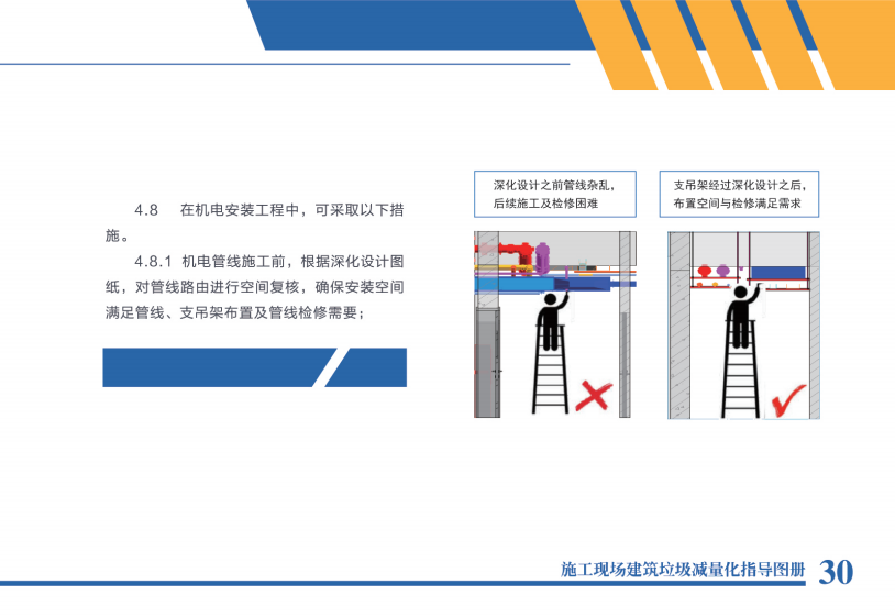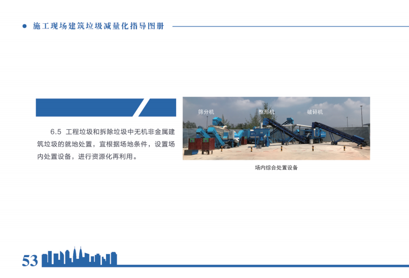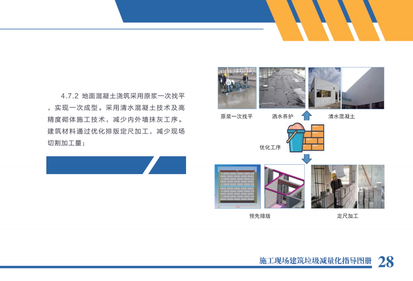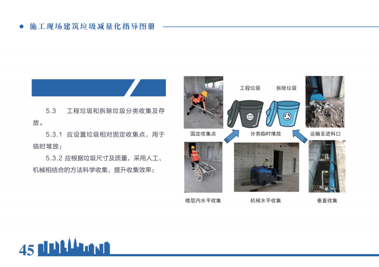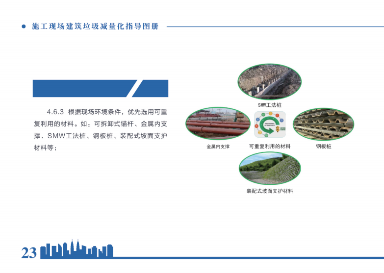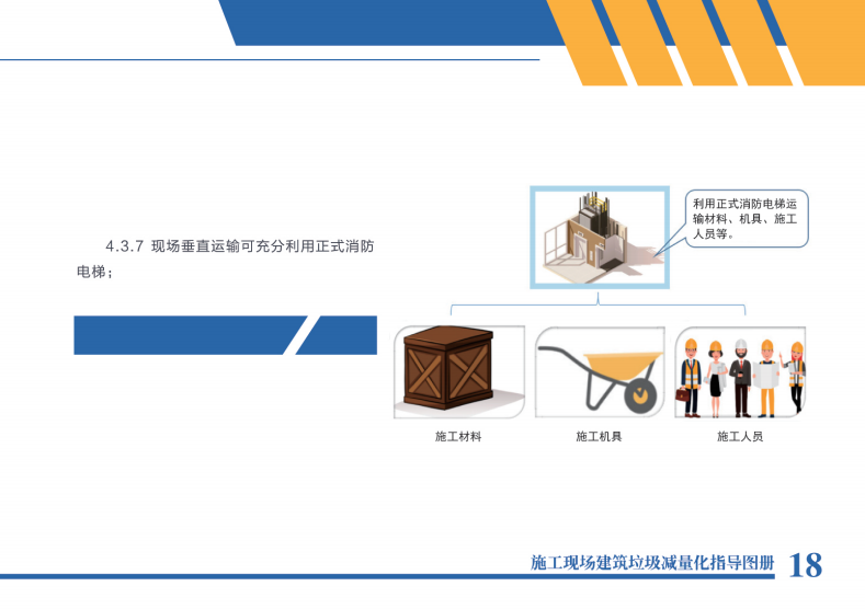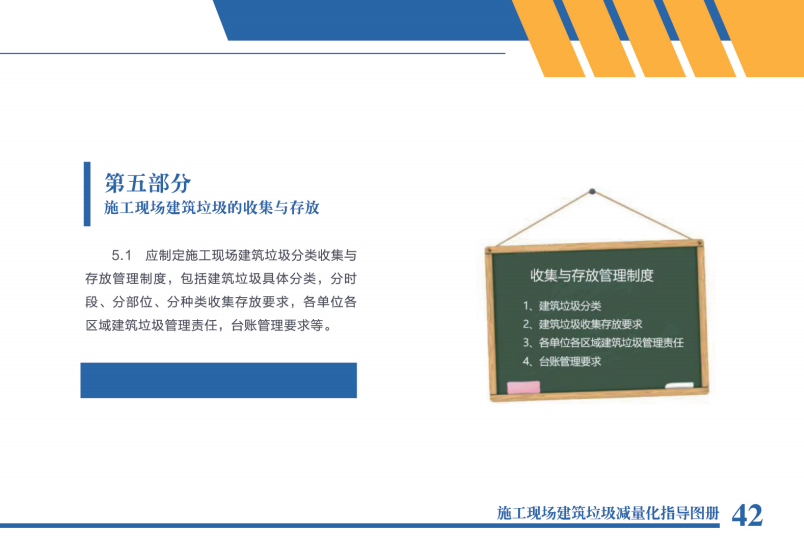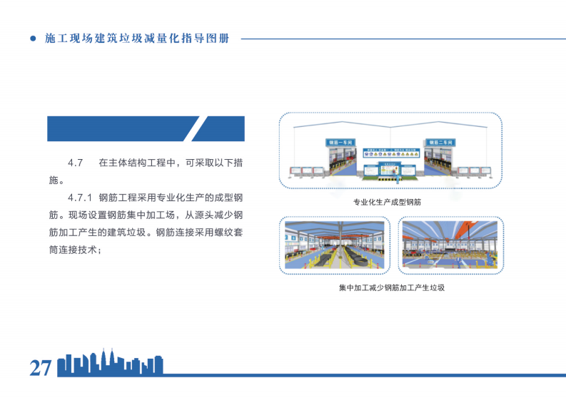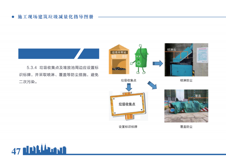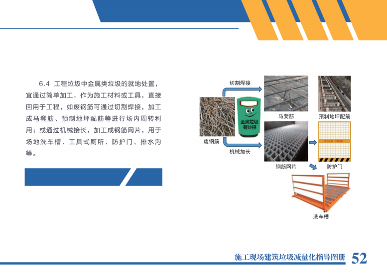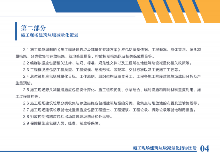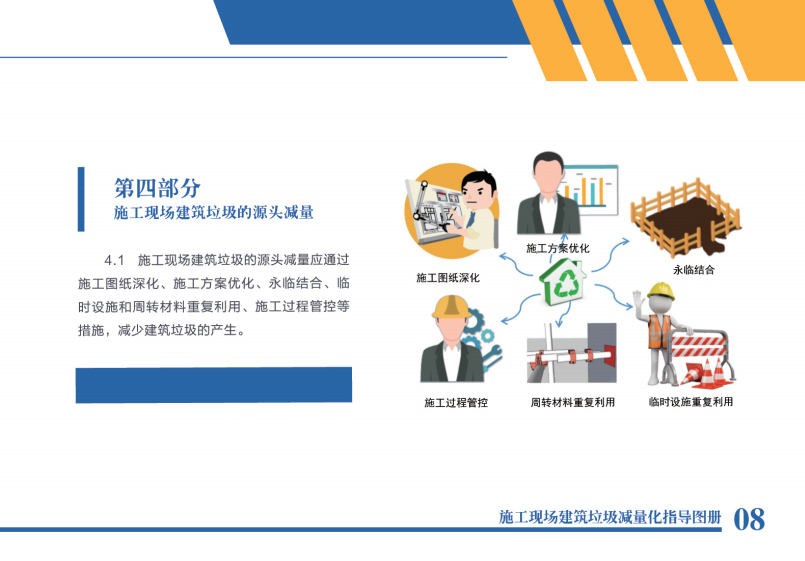 《施工现场建筑垃圾减量化指导图册》共有七个部分:总体要求、施工现场建筑垃圾减量化策划、施工现场建筑垃圾的分类、施工现场建筑垃圾的源头减量、施工现场建筑垃圾的分类收集与存放、施工现场建筑垃圾的就地处置、施工现场建筑垃圾的排放控制。《施工现场建筑垃圾减量化指导图册》适用于新建、改建、扩建房屋建筑和市政基础设施工程,对施工现场建筑垃圾减量化相关要求进行了图文并茂的展示。