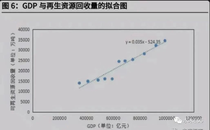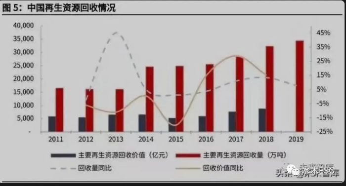 再生资源回收能力、利用效率则体现了我国循环经济发展的水平。2019 年可再生资源回收量达到 3.45 亿吨,同比增长 7.1%,比 2011 年已经翻倍。根据中国再生资源回收利用协会数据,在我国 2021-2035 年 GDP 年均增速 5.5%的情景假设下,得出可再生资源回收量将以 6.55%的年均增速提高,从 2019 年的 3.45 亿吨提升至 2035 年的 8.08 亿吨。