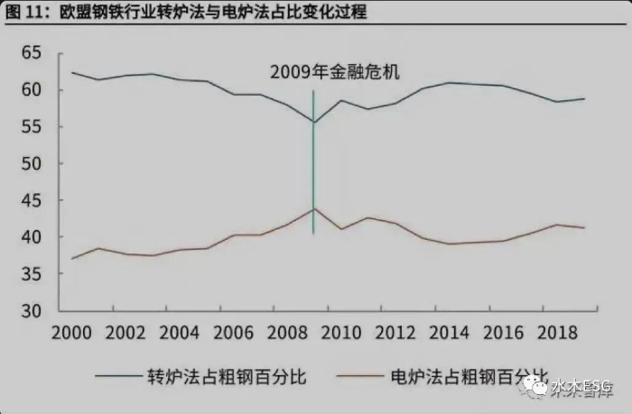 2005-2009 年,欧盟碳市场启动后,受到减排预期影响,电炉比例增加;2009 年金融危机后,欧盟钢铁行业转炉法和电炉法的比例变化趋势发生逆转;背后的 原因可能在于金融危机后政府的进一步扶持下,钢铁行业低碳转型约束减小,这 也侧面体现了碳中和政策实际是受经济景气度影响的。