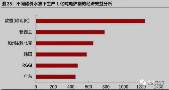根据假设,我们测算出在使用光伏/风力提供电力的情境下,生产 1 亿吨电炉钢 的减排量为 2.55 亿吨 C02。假设碳价为 100 元/吨,带来的经济效益为 100*2.55+ (3000-2500)*0.7*1=605 亿元;在欧盟碳现货市场的碳价水准下,电炉钢的 减碳的经济效益将突破 1200 亿元人民币;即使取折中的韩国碳价水准,经济效 益也能达到约 580 亿元人民币。