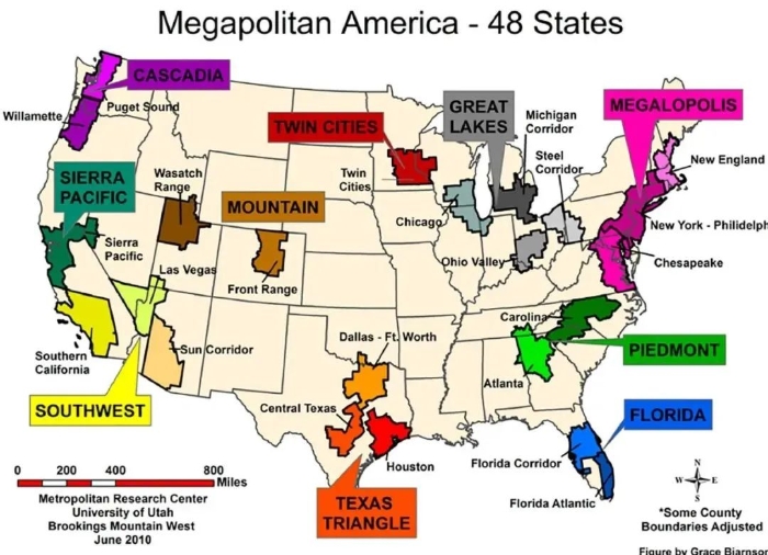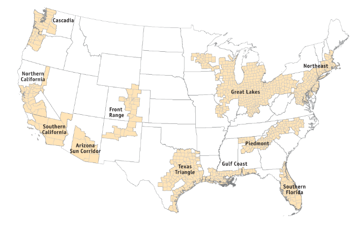 图1 美国巨型都市区(左)及巨型区域(右)的划分