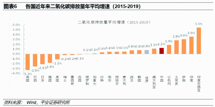 得益于近三十年来各国在应对气候变化方面的共同协作,全球二氧化碳排放量虽然仍保持正增长,但增速大体呈现下降趋势。若从近5年碳排放量的年平均增速来看,部分经济体(如英国、巴西、日本、德国、美国、瑞士、墨西哥、法国)的碳排放量增速已经降为负值。中国近五年碳排放平均增速为1.2%,略高于全球0.8%的水平。