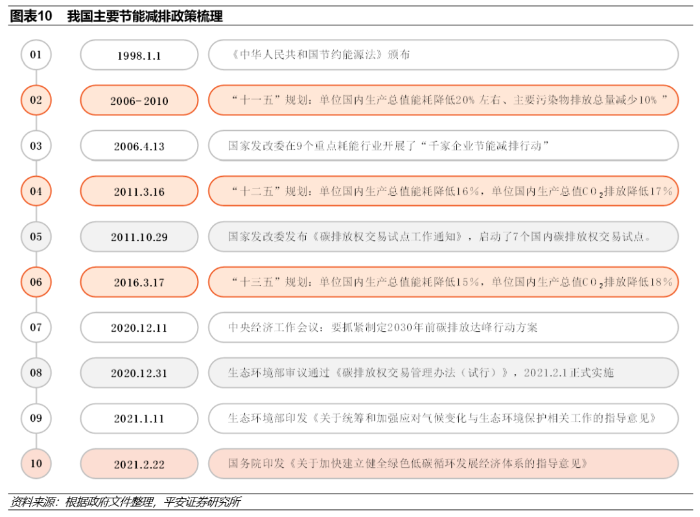 中国早在1998年即颁布了《中华人民共和国节约能源法》,旨在推动全社会节约能源,提高能源利用效率,保护和改善环境,促进经济社会全面协调可持续发展。此后,政府在“十一五”规划期间(2006-2010)首次提出了“节能减排”的具体要求:“‘十一五’期间单位国内生产总值能耗降低20%左右、主要污染物排放总量减少10%”。据此,国家发改委在2006年4月在钢铁、有色、煤炭、电力、石油石化、化工、建材、纺织、造纸等9个重点耗能行业开展了“千家企业节能减排行动”,对年综合能源消费量18万吨标准煤以上的约一千家企业加强节能管理。