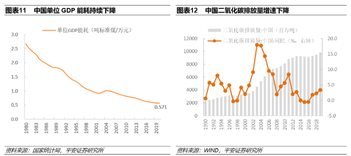 通过相关政策积极推动产业结构调整、能源结构优化以及重点行业能效提升,中国在碳减排方面已取得了显著成效:1980年以来我国的单位 GDP 能耗就持续降低,CO2排放总量增速放缓。碳减排的积极成果为我国实现碳中和目标奠定基础。此外,我国新建立的碳排放交易市场将对我国实现碳中和目标将发挥积极的作用 。