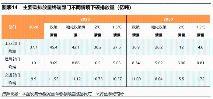 《研究》推算了四个不同情景下各部门的二氧化碳排放量。总体上看,主要的碳排放还是来自于工业部门终端,2020年工业部门碳排放量达到37.7亿吨。工业过程中实现二氧化碳排放降低,一方面需要工业内部结构优化和工艺革新,发展替代原料燃料技术等;另一方面,则需要推动产业结构调整和产品质量升级,从而使得高耗能产品的需求持续下降。