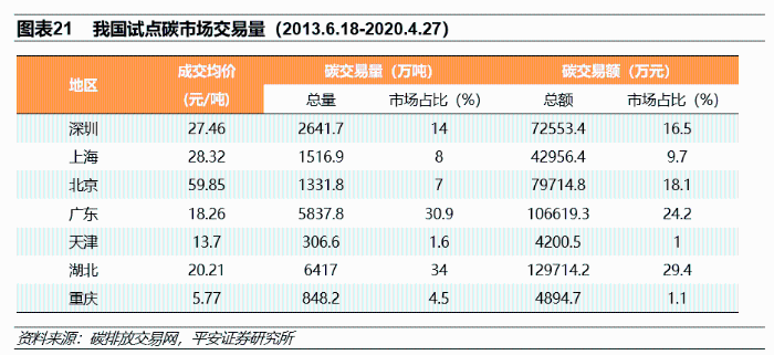 中国碳排放权交易市场仍处于建设初期。2013年,发改委批准包括北京、天津、上海、重庆等在内的11个省市开展碳排放交易试点,以逐步建立国内碳排放交易市场。目前这7个市场的交易量已初具规模(见下表)。2017年,国家发改委印发《全国碳排放权交易市场建设方案(发电行业)》,正式启动全国碳排放交易体系建设工作。截至2020年8月,我国碳排放交易试点省市碳市场共覆盖钢铁、电力、水泥等20多个行业,接近3000家企业,累计成交量超过4亿吨,累计成交额超过90亿元。总体上看,目前我国的碳交易市场仍然处于发展初期,成交量受履约驱动,存在市场活跃度低、企业参与度低、履约推迟现象普遍、信息披露不足等问题。进入2021年,碳交易市场的建设加快推进,生态环境部颁布的《碳排放权交易管理办法(试行)》正式施行,这意味着中国碳市场进入“第一个履约周期[4]”。碳市场的首个履约周期在发电行业实施,全国2225家发电企业将分到碳排放配额;待其稳定运行后,将扩大市场覆盖行业范围、丰富交易品种和方式,完善碳交易市场。
