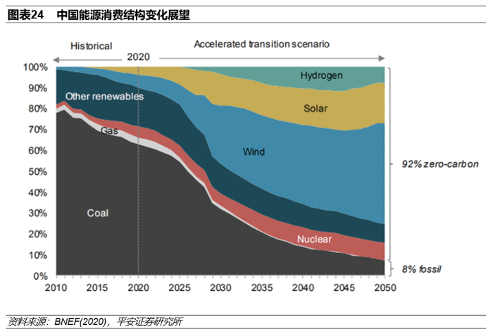根据彭博新能源财经(BNEF)的预测,中国目前约90%的碳排放来自电力和热力生产、工业和交通等领域,为实现碳中和目标,中国的能源结构在“加速转型情景”下将发生颠覆性的变化:预计到2050年,中国的电能将占到终端能源消费比重的53%。其中,92%的电能将由光伏、风电、氢能、核能等为主的零碳能源提供。相比前文所述当前清洁能源在总能源结构中15%左右的占比,可知中国的清洁能源领域未来还有巨大的成长空间;包括水电、风电、太阳能、核电、氢能、生物质能、地热、海洋能等在内的能源行业,伴随着碳中和目标的推进和实现,将获得长足的发展。
