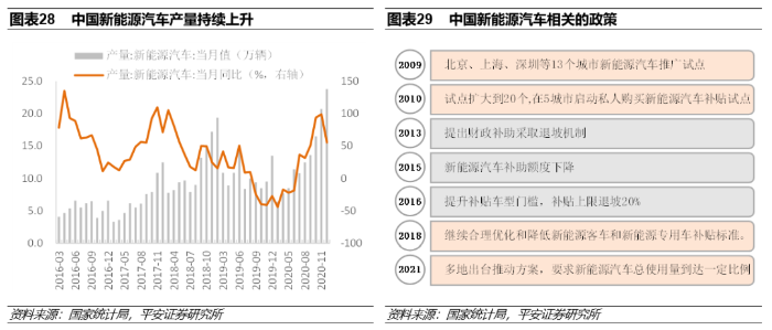 值得一提的是,资本市场近年来高度关注的新能源汽车行业,对于我国实现“30·60目标”具有重要的意义。从生产端看,国务院近期出台了《新能源汽车产业发展规划(2021-2035)》,提出了两阶段目标,对未来新能源汽车市场的发展进行整体部署;从消费端看,政府近年来也在持续出台刺激新能源汽车消费的相关政策。国内新能源汽车产量近年来也呈现震荡攀升的态势,即便在2020年新冠疫情的影响下,产量仍然呈现了快速攀升。