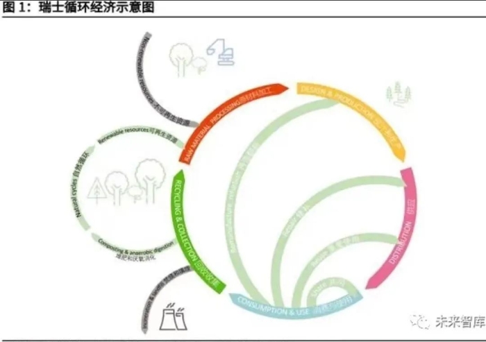 在瑞士、德国等发达国家,循环经济得到高度重视。根据清华 PPP 研究中心引 自瑞士联邦环保部网站的有关数据,2018 年在瑞士产生的一千七百五十万吨建筑垃圾中,有近一千二百万吨(水泥、碎石、沥青等)被回收再利用,城市垃圾中,一半以上被循环利用;在德国饮料瓶、废纸也可通过专门的渠道统一进行回收。在循环经济的框架下,产品的使用年限得到提升,这不仅保护了环境、节约了资源,大部分情况下还能为消费者节省费用,同时为资源再利用企业提供新的商机。