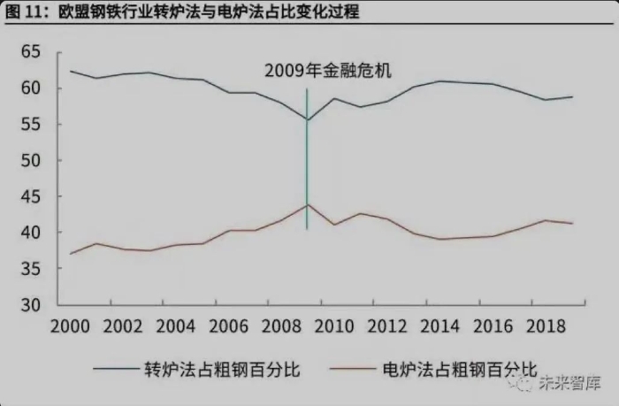 2005-2009 年,欧盟碳市场启动后,受到减排预期影响,电炉比例增加;2009 年金融危机后,欧盟钢铁行业转炉法和电炉法的比例变化趋势发生逆转;背后的 原因可能在于金融危机后政府的进一步扶持下,钢铁行业低碳转型约束减小,这 也侧面体现了碳中和政策实际是受经济景气度影响的。
