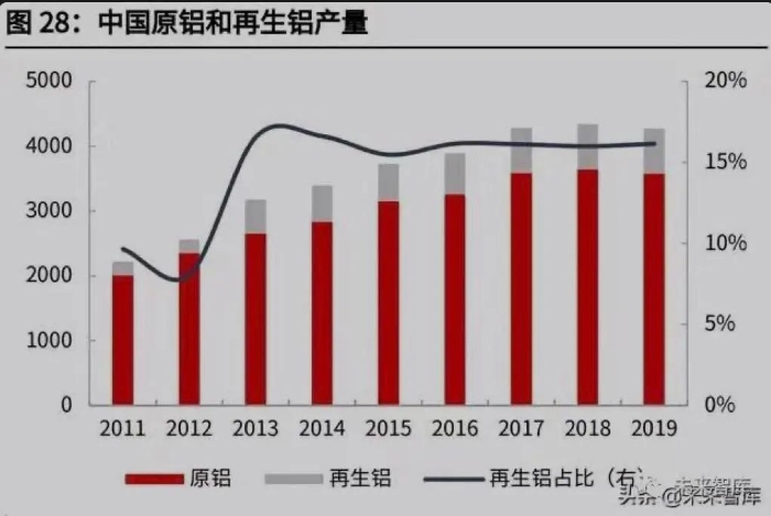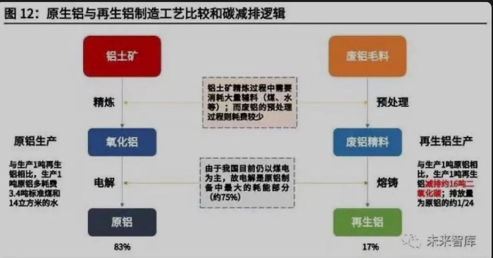 而根据国际铝业协会(IAI)发布的《2050 年铝业温室气体减排路径》中提到的 全球铝行业 2018 年温室气体排放总量、原铝和再生铝产量等数据算出的再生铝 减排效率约为 16.19 tCO2e/t。