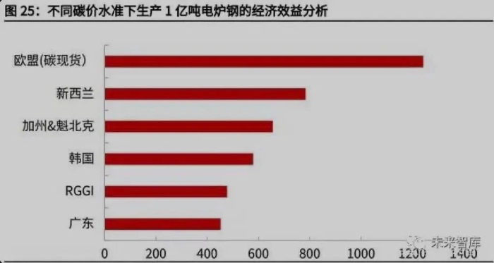 根据假设,我们测算出在使用光伏/风力提供电力的情境下,生产 1 亿吨电炉钢 的减排量为 2.55 亿吨 C02。假设碳价为 100 元/吨,带来的经济效益为 100*2.55+ (3000-2500)*0.7*1=605 亿元;在欧盟碳现货市场的碳价水准下,电炉钢的 减碳的经济效益将突破 1200 亿元人民币;即使取折中的韩国碳价水准,经济效 益也能达到约 580 亿元人民币。