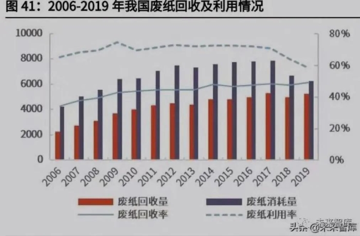 (1)垃圾分类、供给侧改革政策叠加,有助于提升我国的废纸回收率。随 着限废令的逐步趋严,国内废纸原料供不应求,但我国废纸回收率不足 50%, 仍存在较大的提高空间。垃圾分类、供给侧改革政策叠加,有助于提升国内 的废纸回收率,缓解国内废纸短缺的情况,为废纸类企业提供稳定的原材料, 降低企业对于美废等进口废纸的依赖,亦能提高国内对废纸的定价权。