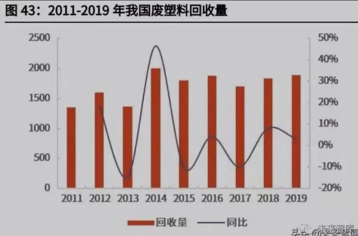 从循环再生阶段来看,传统产业链的再生厂商只是对废塑料进行简单物理回收, 无法得到用于食物和医疗等高质量领域的再生塑料。但禁止进口洋垃圾后,巨大 的供需缺口也促使提高我国回收技术,增加化学回收,生产高质量塑料,提高了 废塑料的利用率。