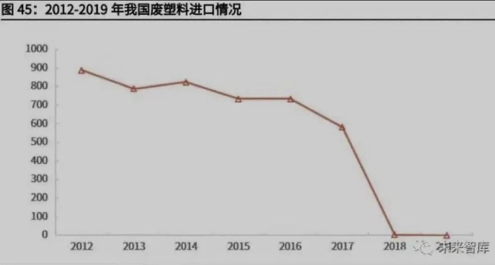 “限废令”政策对我国废塑料进口产生较大冲击。2018 年前,我国废塑料进口 量虽然逐年有下降,但进口量仍保持在 500 万吨以上,2017 年“禁止洋垃圾进 口”政策出台后,2018 我国废塑料的进口数量仅为 5 万吨,同比下降 99.1%, 2019 年进口总量几乎可忽略,同比下降 100%。