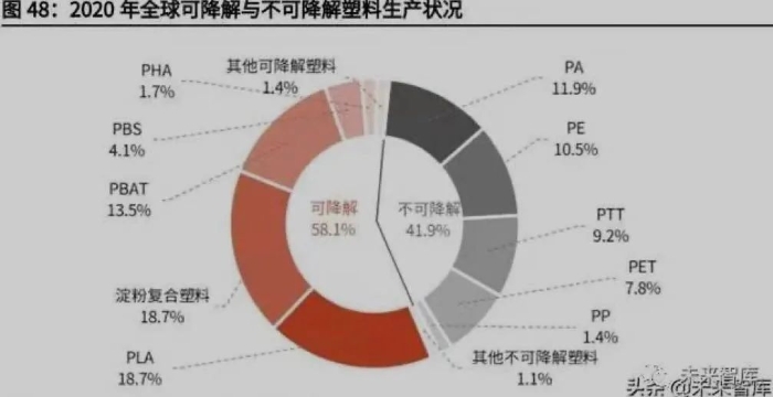 目前可降解塑料中占比前三的是淀粉复合塑料、PLA 和 PBAT,其中淀粉属于天 然材料,性能缺陷很大,使用范围非常受限,难以大规模应用,而 PLA 具有独 特的硬度与透明度性能,PBAT 在软质材料中最具成本优势,这两种材料将成为 未来可降解塑料中成长最快的品种。