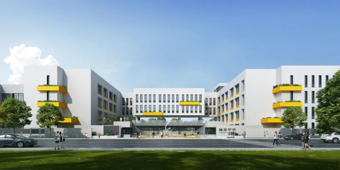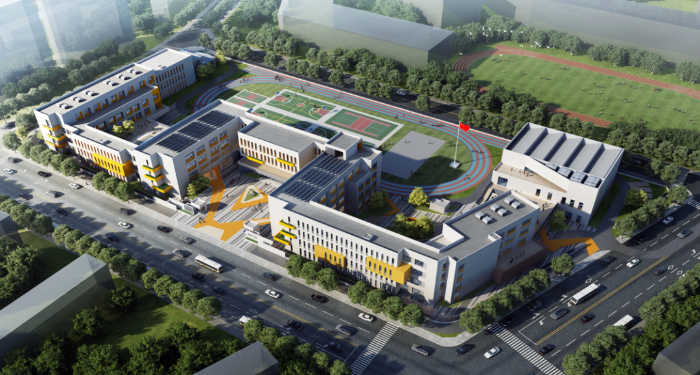 校园规划与城市风貌相呼应,通过主入口广场、伸出的阳台、错落的屋顶和与种植园结合的街角空间,在东侧道路形成了丰富的主界面形态;在西侧的运动区与规划小学的运动区相结合,适时向社会开放,共同构成区域运动文化内核。