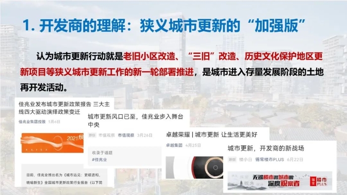 第一种是开发商的理解,认为城市更新行动是老旧小区改造、“三旧”改造等传统城市更新的“加强版”。