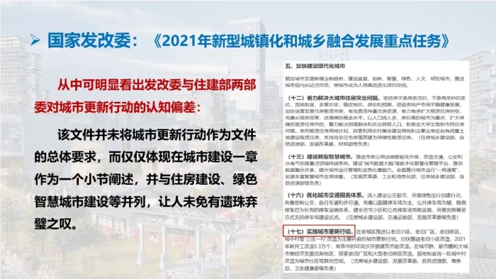 其后,发改委出台了《2021年新型城镇化和城乡融合发展重点任务》,从中更能看出两部委对城市更新行动的认知偏差。该文件并未将城市更新行动作为文件的总体要求,而仅仅体现在城市建设一章作为一个小节阐述,并与住房建设、绿色智慧城市建设等并列,让人未免有遗珠弃璧之叹。