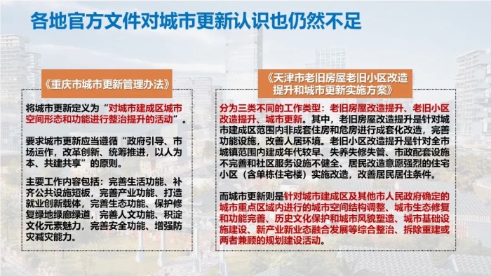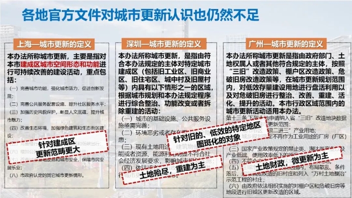 上述概念理解的分歧已在影响城市更新行动的工作部署和机制建设,并且反映到国家和地方相继出台的政策文件中。