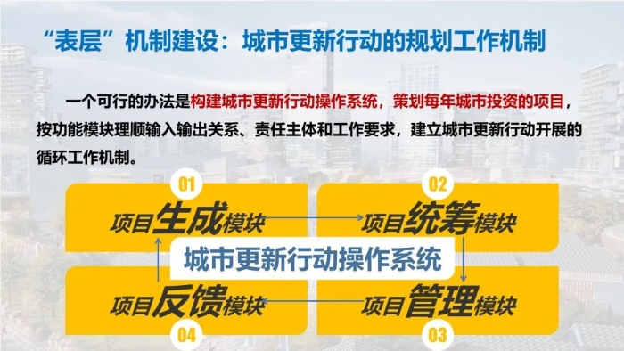 首先是“表层”的工作机制建设。我们曾经建议,应该有一套住建部或者国家下发的城市更新行动的操作系统。分为项目生成、项目统筹、项目管理、项目反馈四个大的功能模块,类似OA(Office Automation,办公自动化)系统进行城市更新行动项目的全周期动态管理,帮助住建部门加强工作的条块统筹,落实资金和政策配套,将城市更新行动一层层推行下去。