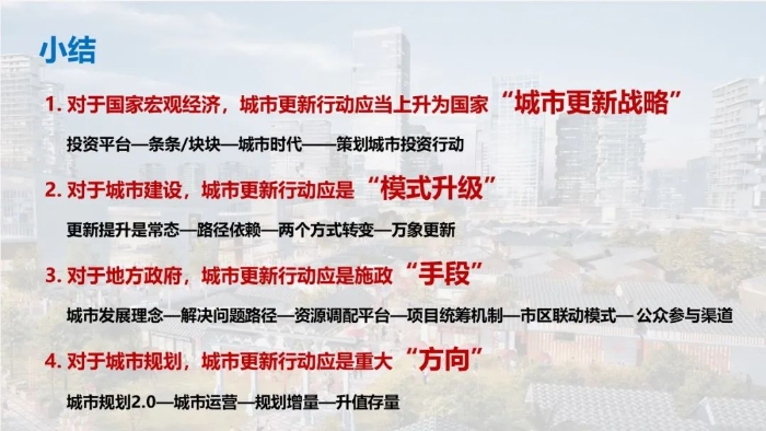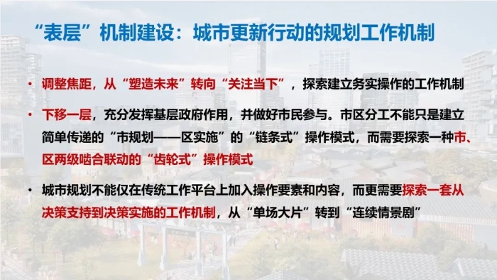 更进一步来看,仅有概念理解的清楚辨析和共识是不够的,要将中央实施城市更新行动的战略意图落到实处,还需要统一系统、全面完善的机制建设,然后更好的推动城市的渐进的改善。这个可以说是我一直理解的初衷。