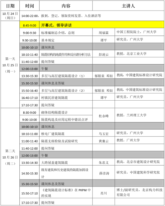 住建部于2021年4月27日批准发布了《建筑隔震设计标准》GB/T51408-2021(以下简称标准),自2021年9月1日起实施。《标准》是我国第一部建筑隔震技术国家标准,其实施将对我国建筑抗震设计带来深远影响。为了尽快帮助广大工程设计人员了解《条例》、学习和全面掌握《标准》的主要内容、掌握建筑抗震和隔震设计方法,减轻房屋建筑因地震破坏造成的人员和财产损失,《标准》主编单位广州大学和中国建筑标准设计研究院有限公司决定于2021年10月25-26日在北京举办“国家标准《建筑隔震设计标准》宣贯培训”,望各有关单位积极选派工程技术人员参加,会议课程安排如下: