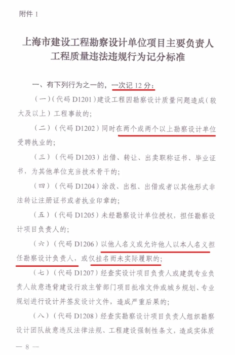 以他人名义或允许他人以本人名义担任勘察设计负责人,或仅挂名而未实际履职的(一次记12分)