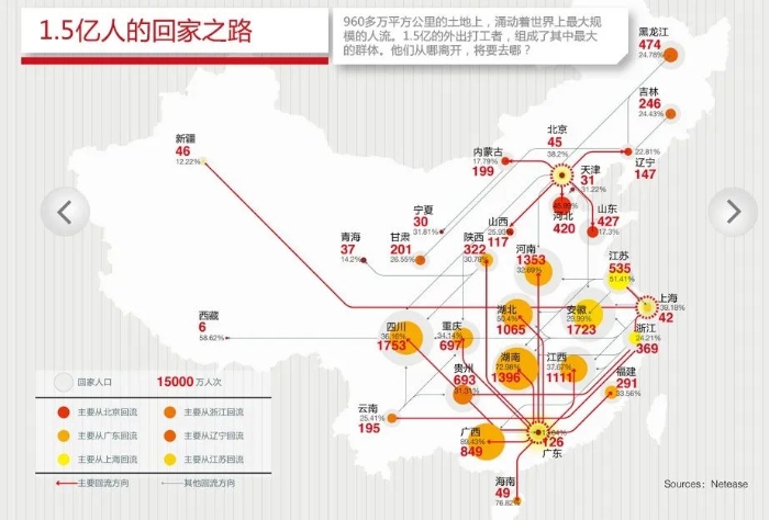 1949年,中华人民共和国成立以来,城市发展方针的核心要义基本都涉及到规模的调控,从改革开放前的计划型管控到改革开放后慢慢意识到市场经济环境下城市规模不完全是靠行政力量能够控制的,再到从大中小城市协调发展,到现在开始关注城市群、都市圈,反映出决策层对城市的态度和认知是在动态变化的,核心的主线便是“规模”。这张图可以反映出我们所面对的真实世界:流动的中国,1.5亿人的回家之路背后是地域之间的一种人口涨落起伏的变化,这种变化使得我们面前很难有一个所谓的静态规模,或者是所谓的可控规模,很多时候充满不确定性。所以,真实的中国是什么样子?它是浮动的,看起来在那个地方,但是下面是有很多“流”在走的。
