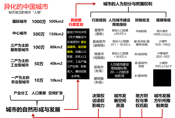 欧美很多城市理论,源于对市场主导的逻辑下形成的城市体系状态的观察和研究。但是我们是什么?民政部有一个设立市县的标准,依据人口密度、财政收入、GDP指标等等,我们的城市被人为划分等级和赋予相应的附属权利,这个权利背后是“有级别”的城市,“级别”带来人均城市建设用地指标、财政税收上缴等一系列城市发展权利的差异。而在这一切背后,可以看到中国城市在决策权、话语权、影响力上有明显差别,在城市所能够获得的资源上不一样,地方的财权和事权不一样,使得我们的城市变成一种异化的城市,这种异化的城市缺乏独立的城市“人格”。我们今天很多时候要解决“大城市病”的时候,必须要认真思考大城市为什么会“病”?人们用脚投票的时候有自己选择决策的动机。如何尊重城市发展规律?规律就在那个地方,最需要的是我们能够客观的认知。