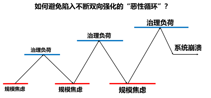 如何避免不断双向强化的恶性循环?因为有规模焦虑,所以要投入更多的治理成本。因为治理负荷很高,结果在做其他决策的时候焦虑又变大了,于是又开始加大负荷,最后财政是经不起公共事务的无限扩张的,可能会走向崩溃,这个是我们需要我们高度警惕的。