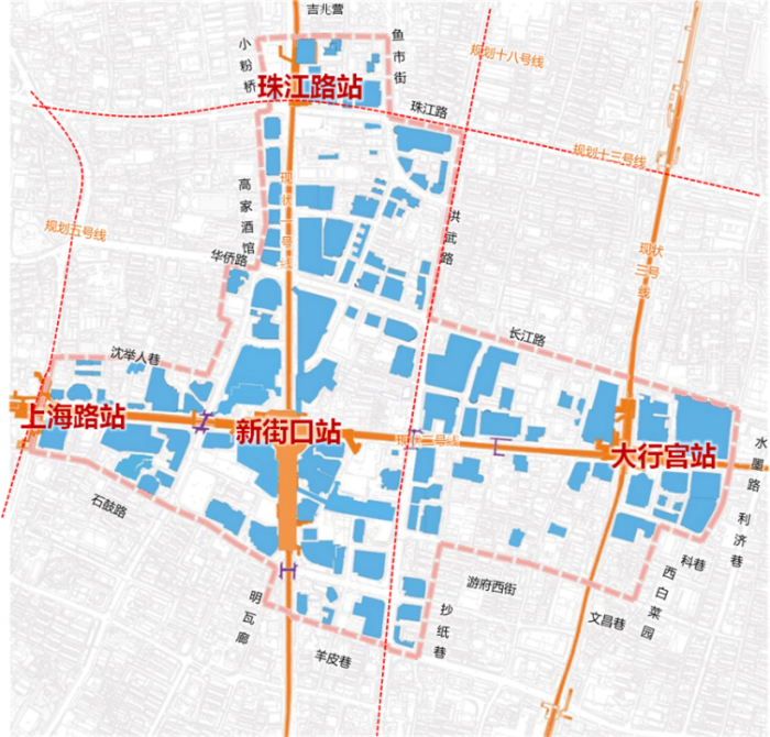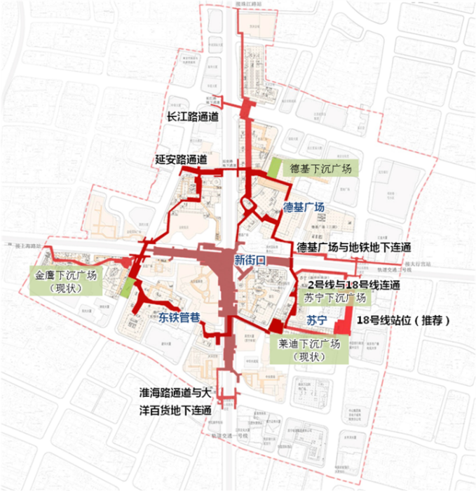 此外,本次规划为近期苏宁新华社地块、德基广场三期、东铁管巷项目等更新地块提供了外部条件,保障了重大项目的实施,也为南京市域地铁18号快线站点选址提供了技术支持,提前进行了地下通道的预控。