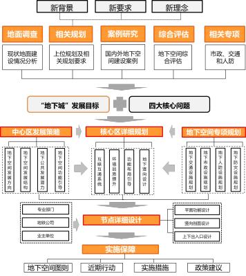 本次规划以“问题”和“目标”为导向,通过相关先进案例研究、对标找差,确定中心区地下空间的发展定位、方向和布局结构,并在此基础上对核心区进行了详细规划,主要包括互通互联系统、环境品质、功能布局和竖向标高等内容。为保证规划的可操作性,本次规划对重要节点进行了深化设计,并且制定了规划设计控制引导图则和实施保障措施。