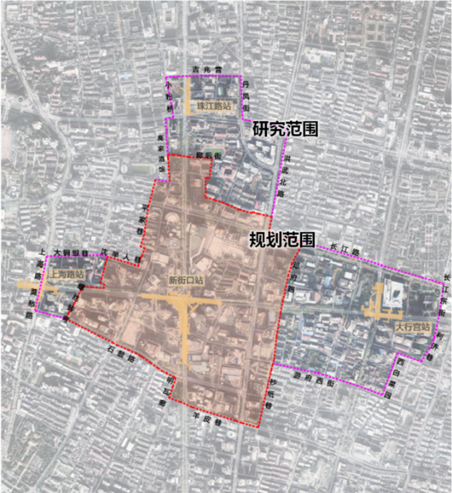 根据《南京市城市地下空间开发利用总体规划(2015-2030)》提出的“建设新街口地下城”的发展目标,针对百年新街口老城中心的特点,本次规划以“挖潜提升”为主要思路,通过“挖潜资源、加强连通、完善功能、提升环境”,将新街口建设成为国内地下空间迭代更新的示范区、南京老城最大的地下城。