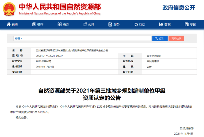 自然资源部关于2021年第三批城乡规划编制单位甲级资质认定的公告