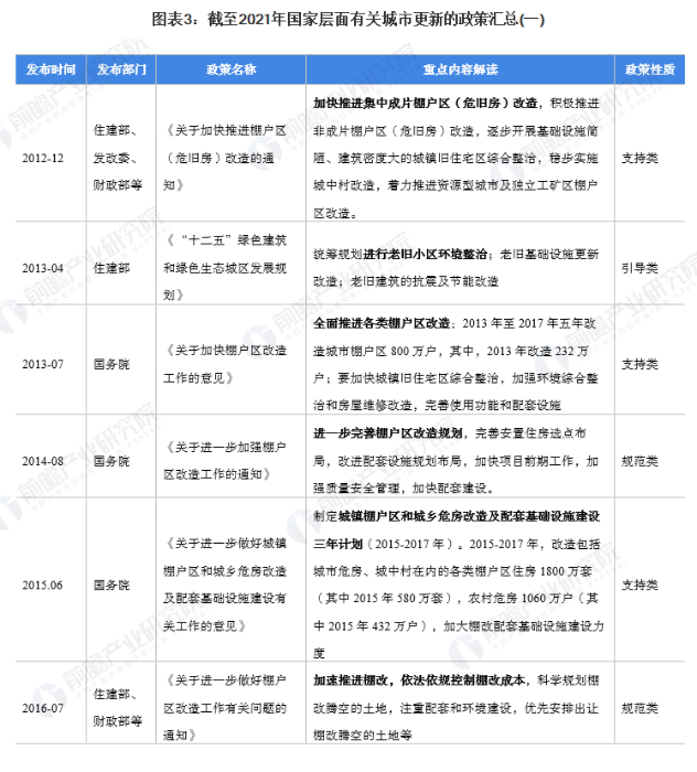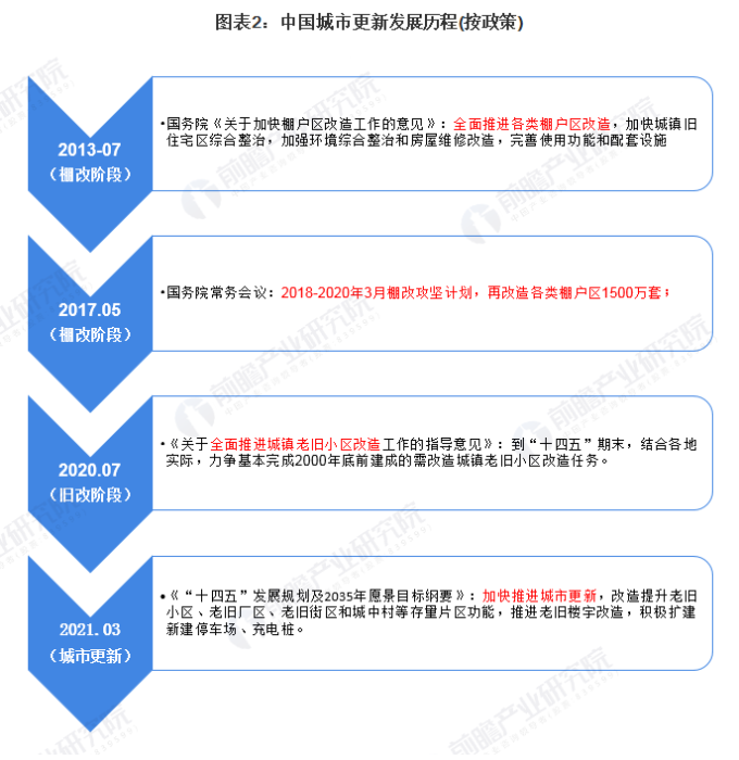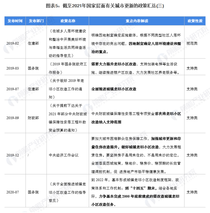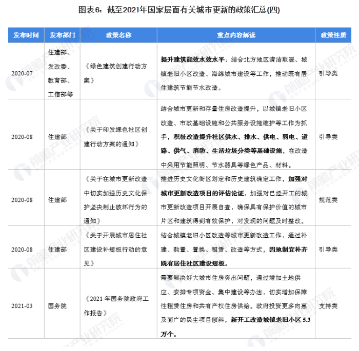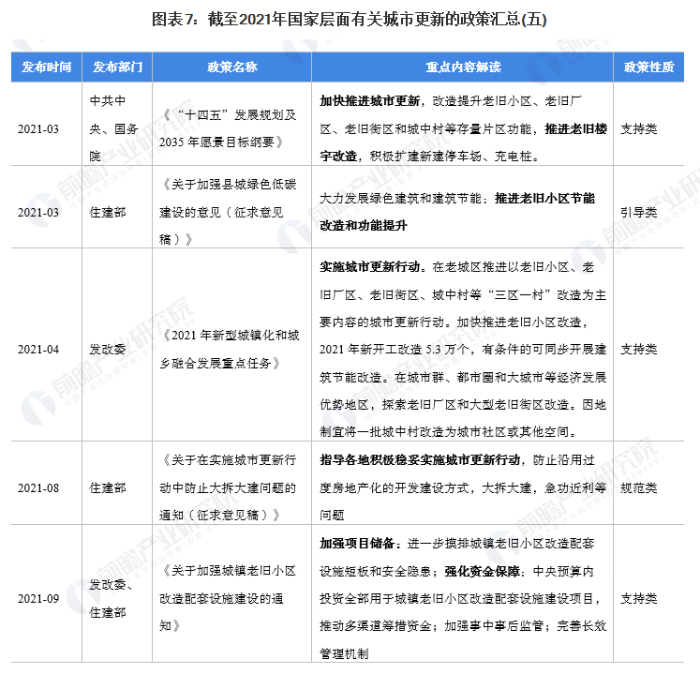 2021年全国两会,城市更新首次被写入政府工作报告;《“十四五”发展规划及2035年愿景目标纲要》中也提出,将实施城市更新行动,推动城市空间结构优化和品质提升,城市更新已升级为国家战略。