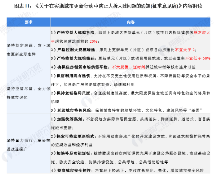 针对各地在积极推动实施城市更新的行动中,出现继续沿用过度房地产化的开发建设方式,大拆大建,急功近利的倾向,为积极稳妥实施城市更新行动,2021年8月,住建部印发,《关于在实施城市更新行动中防止大拆大建问题的通知(征求意见稿)》,对各地的城市更新行动提出以下要求: