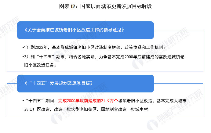 一方面,根据国务院2020年7月公布的《关于全面推进城镇老旧小区改造工作的指导意见》,其中针对2022年和“十四五”期末确定了发展目标;另一方面,根据《“十四五”发展规划及愿景目标》,其中明确,“十四五”期间,完成2000年底前建成的21.9万个城镇老旧小区改造,基本完成大城市老旧厂区改造,改造一批大型老旧街区,因地制宜改造一批城中村。