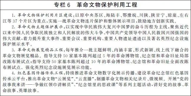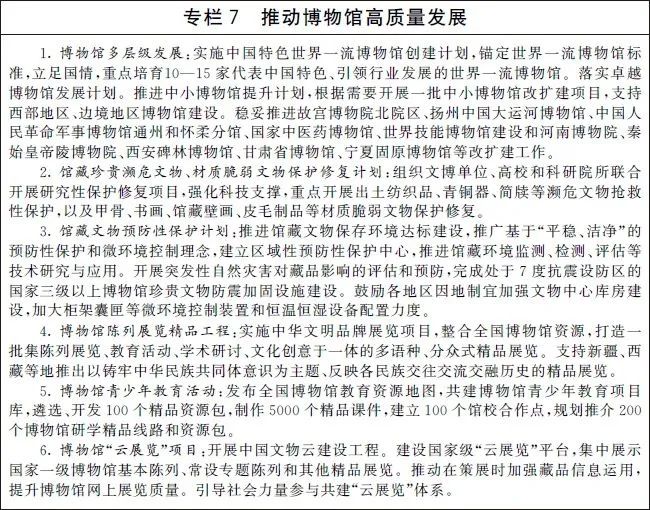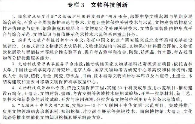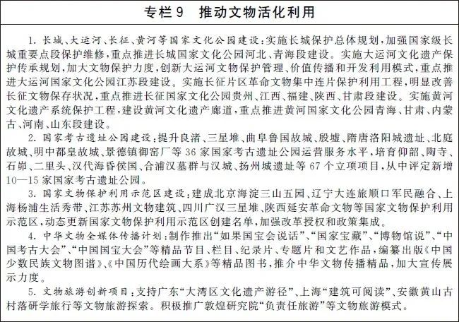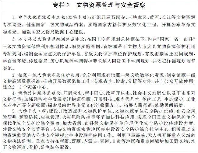 《规划》部署十项重点任务。一是强化文物资源管理和文物安全工作,建设国家文物资源大数据库,健全文物安全长效机制;二是全面加强文物科技创新,构建产学研用深度融合的文物科技创新体系;三是提升考古工作能力和科技考古水平,建设中国特色、中国风格、中国气派的考古学;四是强化文物古迹保护,坚持系统整体保护;五是加强革命文物保护管理运用,充分发挥革命文物重要作用;六是激发博物馆创新活力,提升博物馆发展质量;七是优化社会文物管理服务,完善流失文物追索返还制度;八是大力推进让文物活起来,推动文物保护利用工作全面融入经济社会发展;九是加强文物国际交流合作,向全世界讲好中国故事,促进中外文明交流互鉴;十是壮大文物人才队伍,综合施策推动构建与文物资源规模、文物保护利用任务相匹配的学科结构、管理机构和专业队伍。