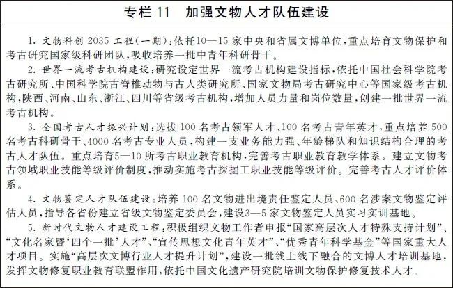 培育一批以领军人才和中青年骨干创新人才为重点的高层次文物人才,加强考古、科技创新、文物鉴定、文物修复、文物展览等急需领域人才培养,加快建设一支门类齐全、技艺精湛的文物技能人才队伍,稳步造就一支科技研发能力和技术应用能力过硬的文物科技人才队伍,锤炼一支熟悉专业、素质优良的文物管理人才队伍。加强相关行业文物保护人才培养。