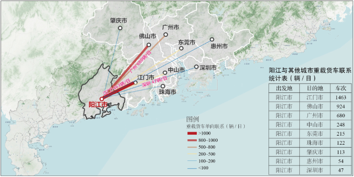 长期以来,粤东西北与珠江三角洲的区域发展不平衡,一直是广东经济发展存在的最大短板。在广东进一步推进高质量发展的过程中,破解这一短板成为区域协同发展必须解决的问题。广东省在粤港澳大湾区和深圳先行示范区“双区”引领下,正在编制中的广东省国土空间规划,规划建设湛茂都市圈、广州都市圈、深圳都市圈、珠江西岸都市圈、汕潮揭都市圈五大现代化都市圈,带动省内协同发展新格局。阳江地处粤西,规划纳入珠江西岸都市圈,是湾区向西的第一座城市,也是粤港澳大湾区与西部湛茂都市圈两大城市群链接的区域支点,起着联系“中转站”的作用,需要在承接核心城市功能辐射的同时,联动邻近城市共同形成区域一体化的空间结构。目前从物流方面来看,根据重载货车联系数据,阳江与广州货车联系仅为680辆/日,与深圳联系仅47辆/日,与广佛间5479辆/日的联系量相比,阳江与大湾区核心城市的物流联系偏弱,区域联系不强(见图2)。从客流方面分析,由于阳江目前与大湾区的核心城市广州、深圳缺乏高速铁路直接联通(至广州高铁出行为1.5小时,深圳为2.5小时),也使得阳江未能有效融入区域一体化进程中。根据中国移动手机信令数据(2021年4月数据),进行人口驻留地识别与区域交换量测算,按在目的地停留2个小时以上作为交换量,发现阳江与湾区其他城市每日发生不足5万人次交换量,对外联系偏弱。阳江与核心城市功能联系偏弱,致使其成为区域“流空间”上的“断裂点”,难以承担起节点城市的区域责任,也将使得粤港澳大湾区带动粤西地区发展缺乏有效支撑。