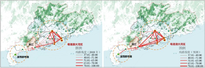 图3 阳江与湾区城市单通道联系(左)与阳江多通道直连广深等湾区核心城市(右)模拟分析结果图