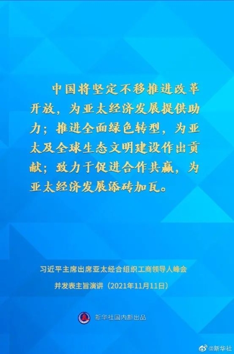 ——中国将致力于促进合作共赢,为亚太经济发展添砖加瓦。中国一直积极融入亚太区域合作,始终是亚太开放合作的推动者。中国将坚持真正的多边主义,维护以世界贸易组织为核心的多边贸易体制,积极参与全球经济治理,推动建设开放型世界经济。中国将坚定推进高质量共建“一带一路”,促进亚太互联互通,维护区域产业链供应链稳定顺畅,深化同各方在电子商务、数字物流等领域合作,为亚太经济复苏和可持续发展注入动力。