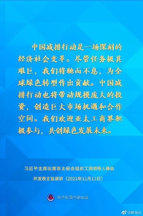 中国减排行动是一场深刻的经济社会变革。尽管任务极其艰巨,我们将驰而不息,为全球绿色转型作出贡献。中国减排行动也将带动规模庞大的投资,创造巨大市场机遇和合作空间。我们欢迎亚太工商界积极参与,共创绿色发展未来。