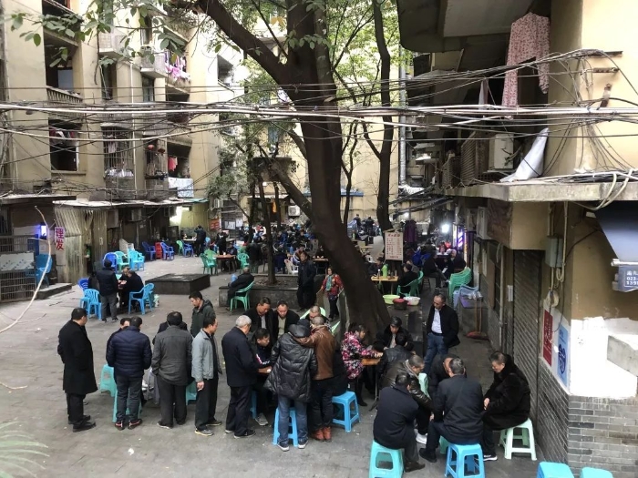 住宅楼间的空地成为大型麻将、棋牌“竞技场”。图为重庆磨房巷小区。(摄影/崔国)
