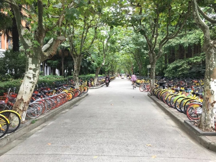 城市的很多空间不适应今天的社会现实,例如共享单车对人行道的挤压。图为同济大学。(摄影/崔国)